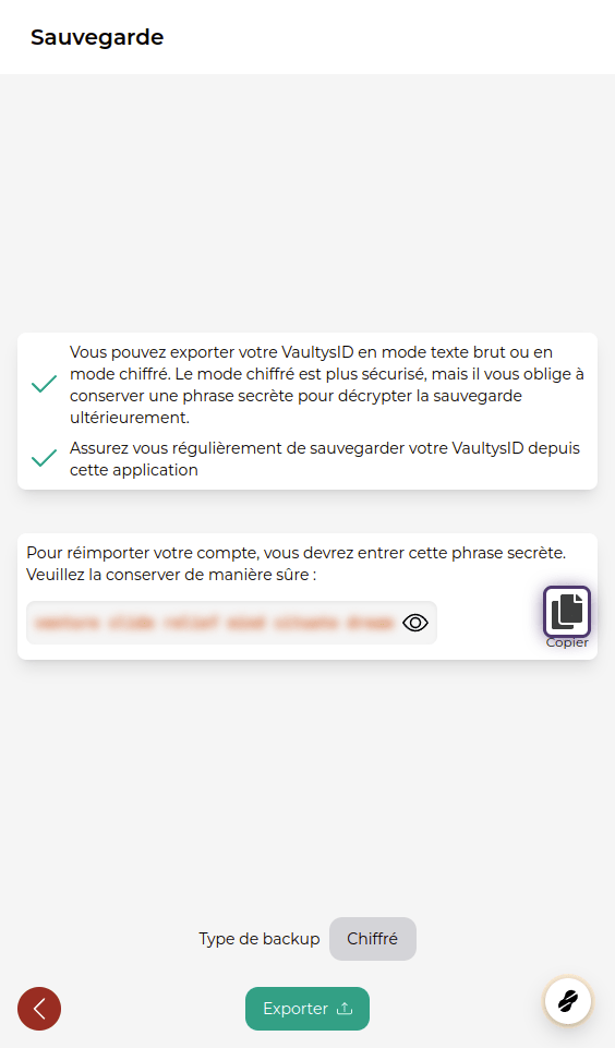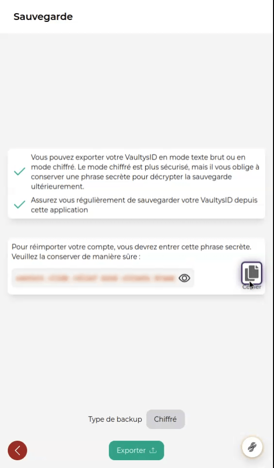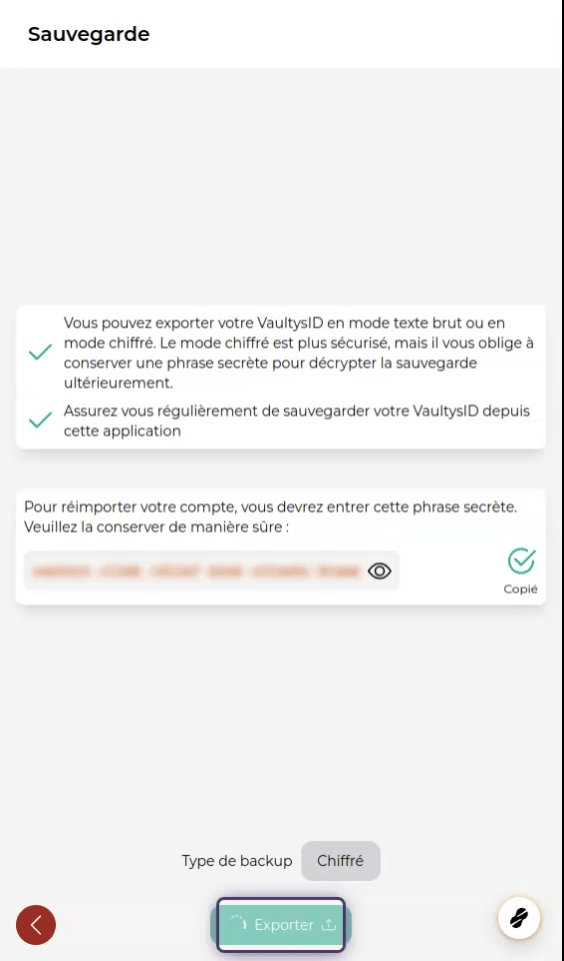 Cliquez sur exporter. Si vous êtes en mode chiffré, l'exportation peut prendre quelques secondes. A la fin de la procédure, un fichier sera téléchargé sur votre téléphone. Veuillez à conserver ce fichier dans un endroit sûr.