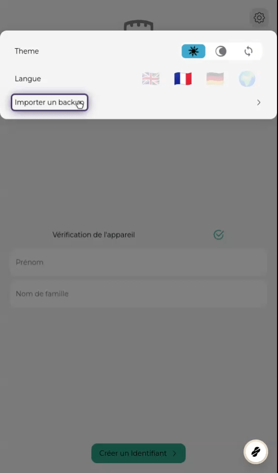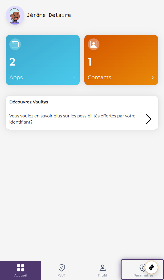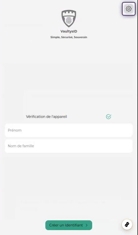 Lors du lancement de VaultysID sur un nouvel appareil, cliquez sur la roue dentée pour accéder aux paramètres. Ou si vous avez déjà une identité Vaultys sur cet appareil rendez-vous dans l'onglet paramètres.