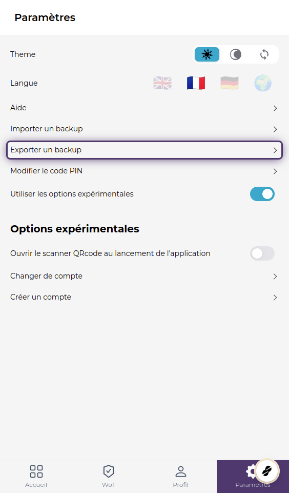 Vous pouvez exporter votre backup en clair, ou de manière chiffrée. Si vous exportez en clair, vos données seront enregistrées dans un fichier de manière lisible, restez donc très prudent avec le fichier.
