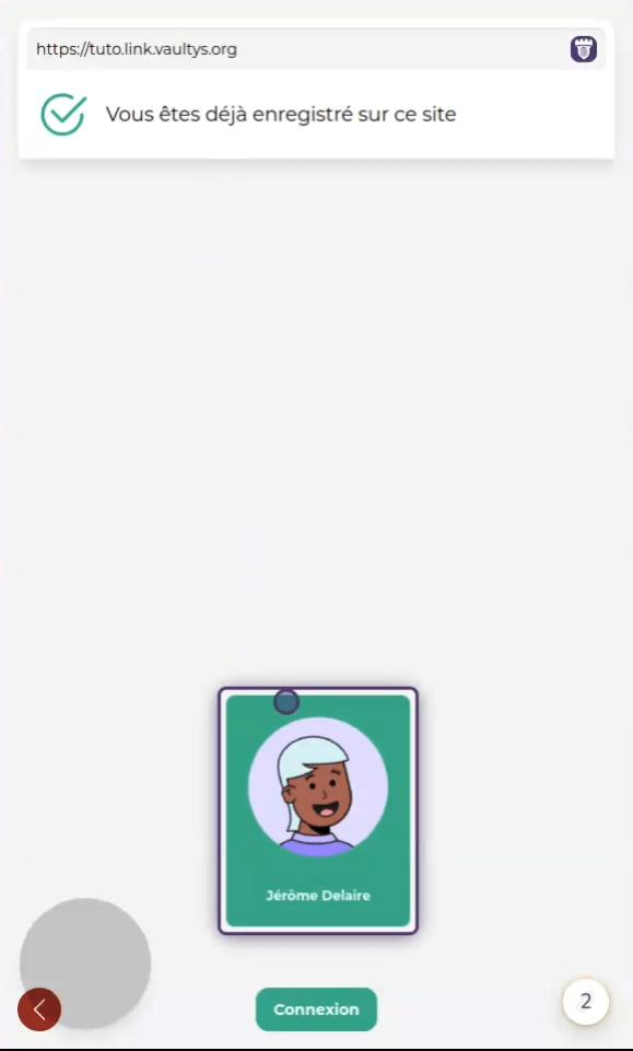 Après avoir scanné un QR code de connexion avec VaultysID, vous arrivez sur la page de connexion. Vous retrouvez la liste de vos profils sur le bas de l'écran. Cliquez sur le profil avec lequel vous souhaitez vous connecter.