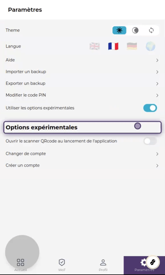 Activer les options expérimentales pour obtenir plus de paramètres. Vous pourrez notamment créer plus d'identités, ou activer l'ouverture automatique du scanner à l'ouverture de l'application.