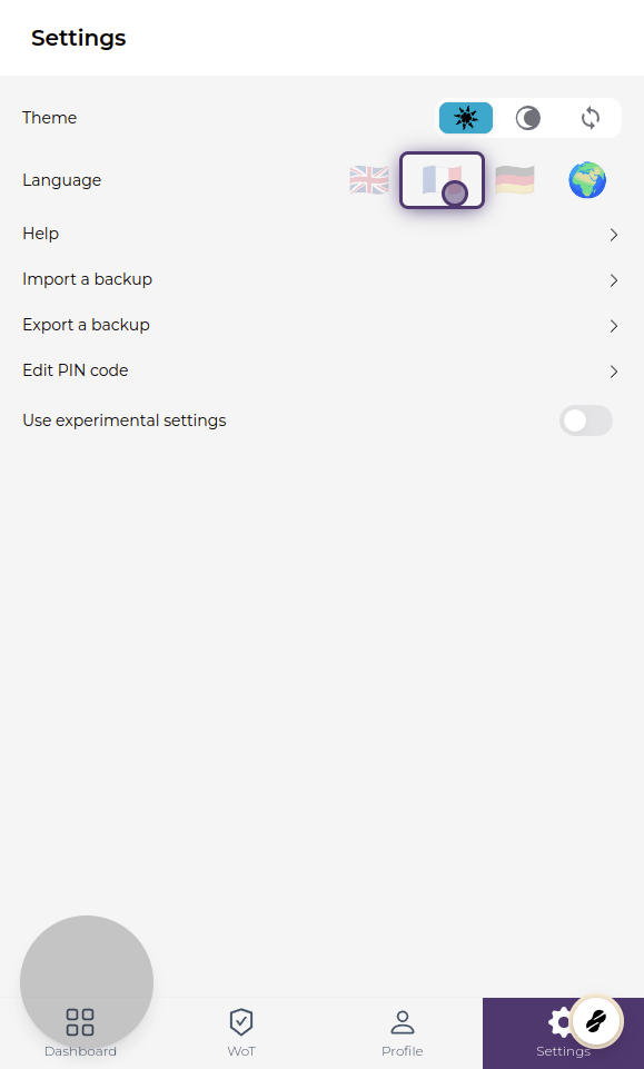 Par défaut l'application utilisera le thème (sombre/clair) définit par votre système. Vous pouvez forcer le mode sombre en cliquant sur la lune, ou le mode clair en cliquant sur le soleil.