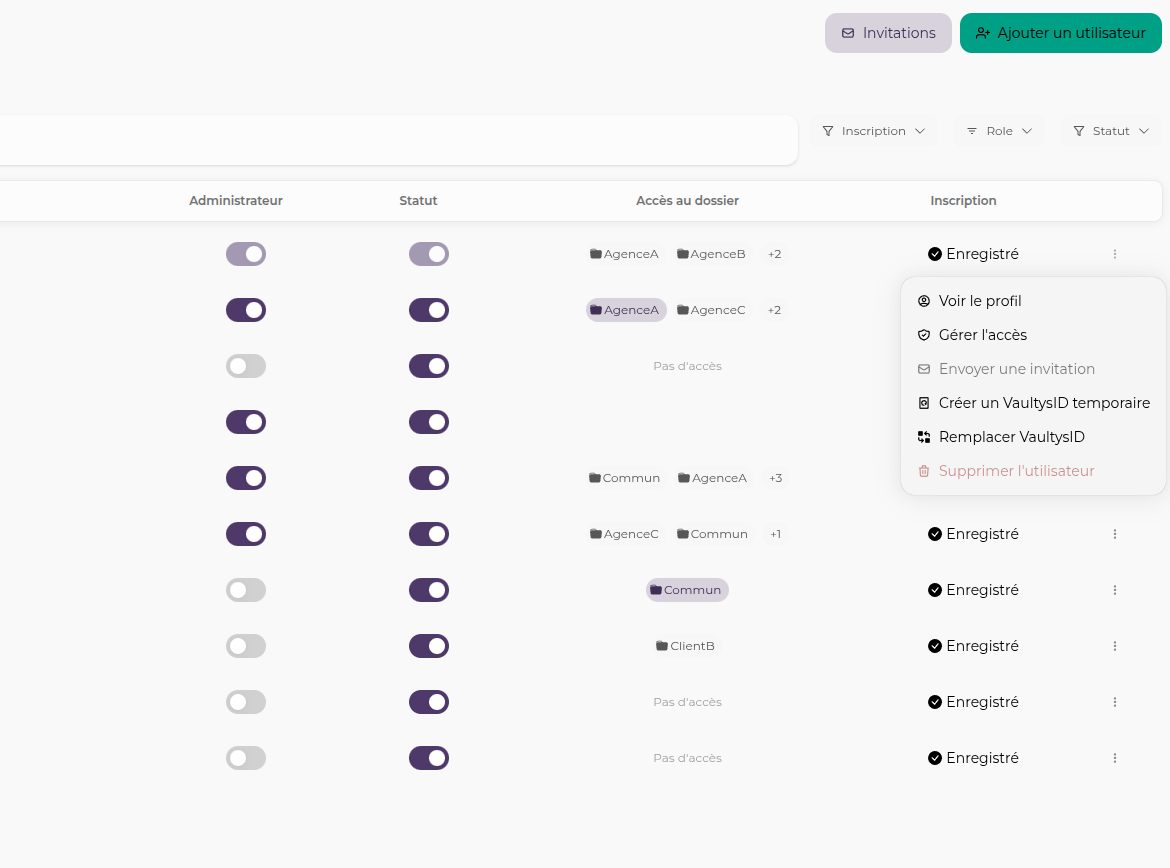 La gestion des utilisateurs a été améliorée ! Un nouveau bouton vous permet d'envoyer toutes vos invitations en un click ! Deux nouvelles actions font leur apparition : "Créer un VaultysID temporaire" et "Remplacer VaultysID".