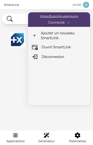 您将进入智能链接添加屏幕。在相应的字段中输入您的智能链接的URL(例如:https://mon-smartlink.link.vaultys.org)。
